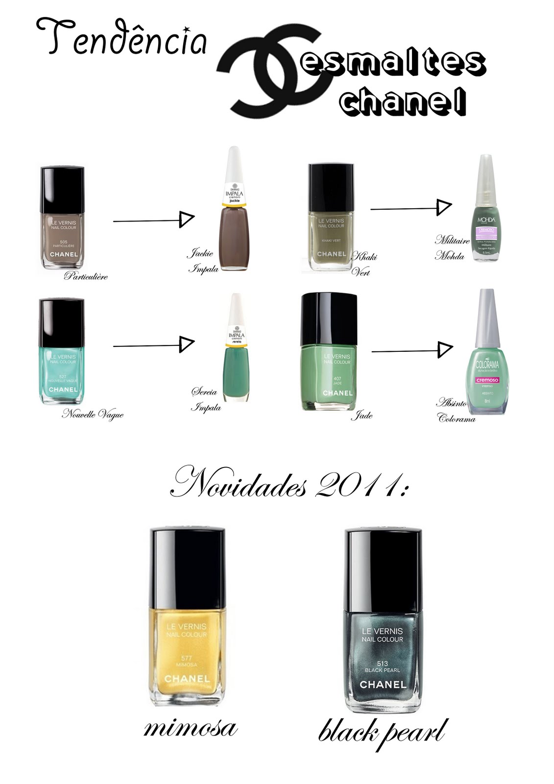 Inúmeras marcas lançaram cores parecidas com os queridinhos das endinheiradas, e com as cores de 2011 com certeza não será diferente. Vem chegando o Mimosa e o Black Pearl, duas cores que já se ouve falar muito.
